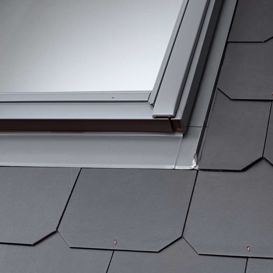 Оклад для установки мансардных окон моделей Классика, Дизайн и Панорама в плоские кровельные материалы (гибкую черепиицу, плоскую кровельную плитку) и материалы толщиной до 16 мм (2 x 8 мм), включая плоские металлические листы. Код оклада EDS. Выполнен из алюминиевого листа, окрашен в темно-cерый цвет (RAL 7043).