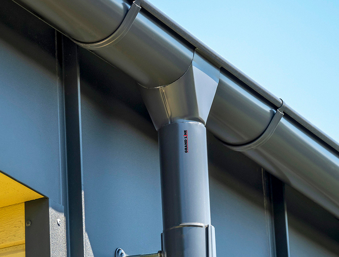 Простая аккуратная дешевая металлическая водосточная система Grand Line Optima изготавливается из холоднокатаной горячеоцинкованной стали с цветным полимерным покрытием полиэстер.